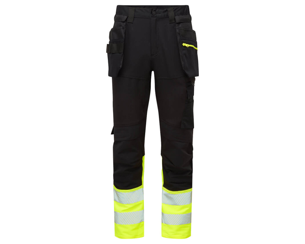 A DX4 Hi-Vis craft nadrág levehető lengőzsebbel dinamikus 4 irányú stretch alapanyag biztosítja a maximális mozgástartományt munka közben. A nadrág hátul magasított derékpánttal és oldalsó elasztikával rendelkezik, amely minden munkapozícióban védelmet biztosít. Előre hajlított, felülről tölthető, állítható térdvédő zsebek, nagyméretű elülső zsebek, levehető holster zseb és a többfunkciós zippzáras combzsebek biztonságos tárolást kínálnak. Háromszoros varrás a maximális tartósság érdekében.