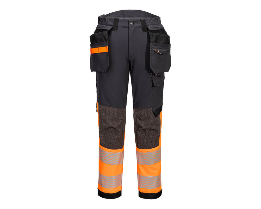 Az EV4 Hi-Vis Stretch Holster nadrág továbbfejlesztett ergonómiai kialakítású, a lézervágott szellőzőrendszerek elhelyezésével maximális szellőzést biztosít munka közben. A nadrág hátul magasított derékpánttal és oldalsó elasztikával rendelkezik, amely minden munkapozícióban védelmet biztosít. Az előrehajló, felülről tölthető, állítható térdpárnazsebek, a nagyméretű elülső zsebek és a többfunkciós cipzáras combzsebek biztonságos tárolást biztosítanak a telefon, a tollak és a szerszámok számára. Háromszoros varrás a maximális tartósság érdekében.