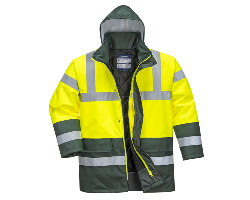 Kedvelt kontraszt színösszeállítású jól láthatósági kabát. Melegen és szárazon tart minden időjárási helyzetben. Teljesen vízálló, rejtett kapucnival, kötött mandzsettával, kétirányú zippzárral készül.