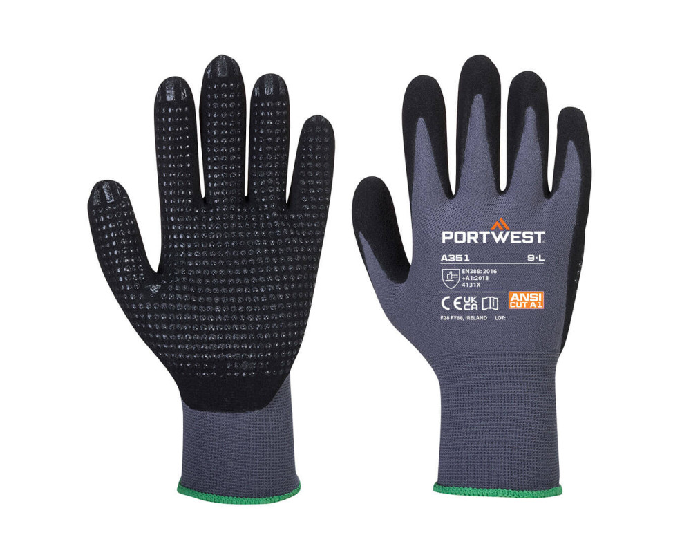 Az A351 pöttyözött tenyérrel rendelkezik, amely javítja a fogásbiztonságot és további tenyérvédelmet biztosít. A légáteresztő, varrás nélküli bélés ideális a száraz környezetben történő precíz kezeléshez.