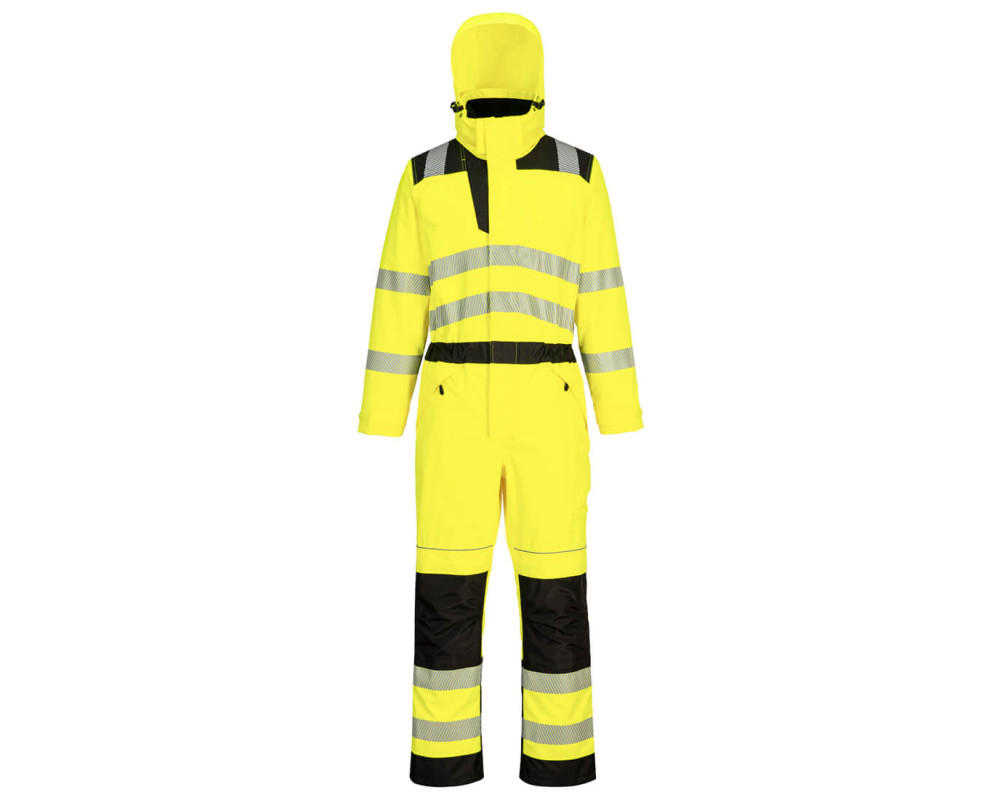 Prémium PW3 Hi-Vis overál, amely a teljes biztonságot a legmodernebb designnal ötvözi. A méltán híres 300D Oxford PU bevonatú, tartós, foltálló alapanyagból készült, modern kialakítású kabát számos kiemelkedő tulajdonsággal rendelkezik, beleértve a levehető, steppelt bélésű kapucnit, a maximális hővédelmet biztosító vastag téli bélést, az extra hosszú oldalsó zippzárakat a könnyű fel- és levétel érdekében, valamint 8 funkcionális, biztonságos tárolózsebet, beleértve a felülről tölthető térdvédő zsebeket is.