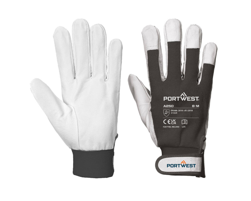 Tartós kecskebőr kesztyű, tépőzáras rögzítéssel, pamut kézháttal és megerősített ujjvégekkel. Kiváló megoldás könnyű ipari munkákhoz.